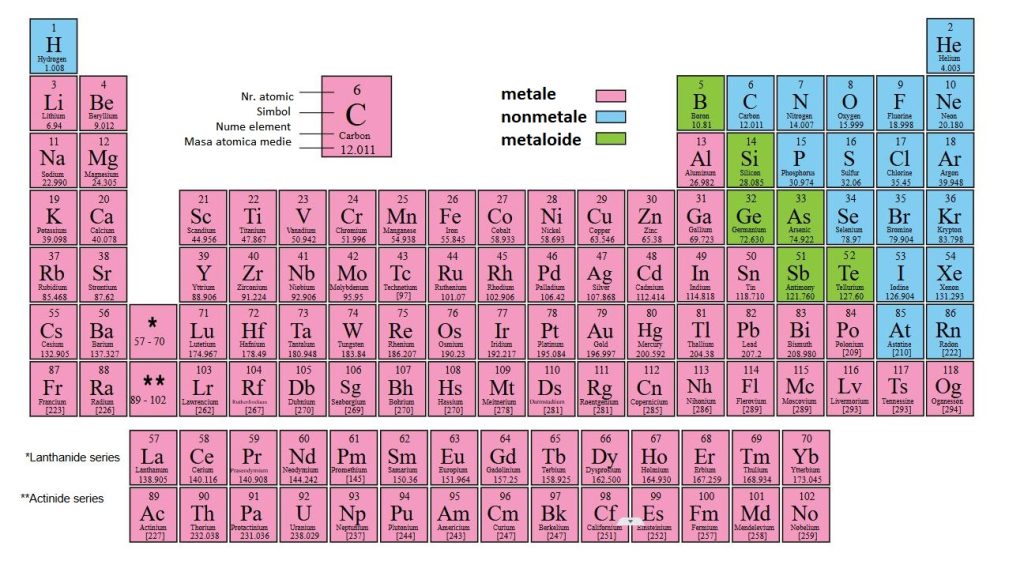 1. Pe orizontală, elementele sunt aranjate în perioade – șiruri numerotate de la 1 la 7 – în ordinea crescătoare a numărului atomic (numărul de protoni din nucleu). Pe măsură ce parcurgi o perioadă de la stânga la dreapta, caracterul elementelor se transformă: începi cu metale extrem de reactive, treci prin metale stabile, apoi prin nemetale și termini cu gaze nobile care sunt foarte puțin reactive.